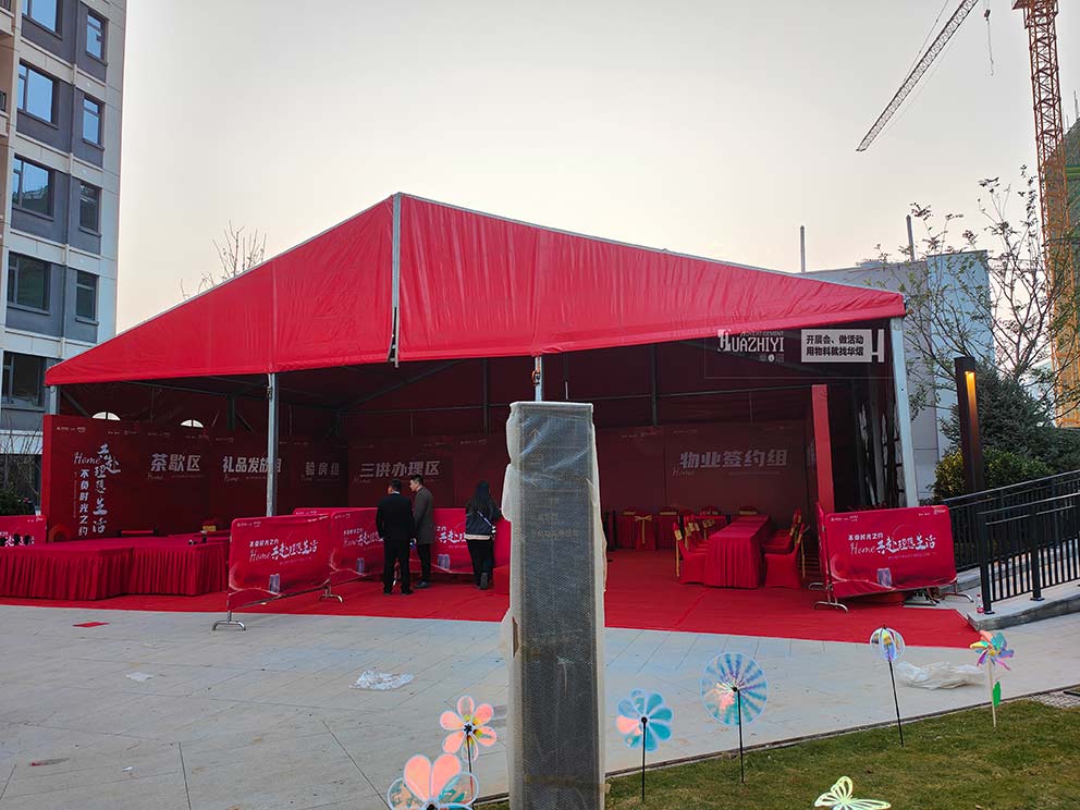 紅色篷房以其獨(dú)特的造型和鮮艷的色彩,成為了交房現(xiàn)場(chǎng)的一大亮點(diǎn)。篷房?jī)?nèi)部寬敞明亮,布局合理,為購(gòu)房者提供了一個(gè)舒適、寬敞的選房和咨詢環(huán)境。同時(shí),篷房外部的紅色裝飾與地產(chǎn)項(xiàng)目的整體風(fēng)格相得益彰,為項(xiàng)目增添了濃厚的喜慶氛圍。