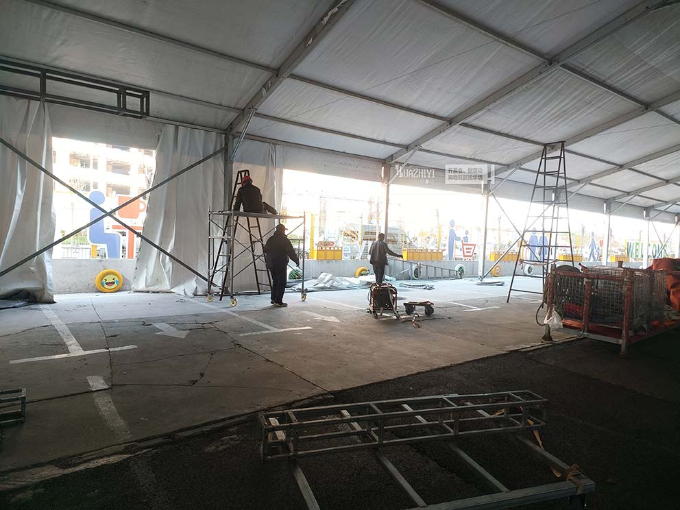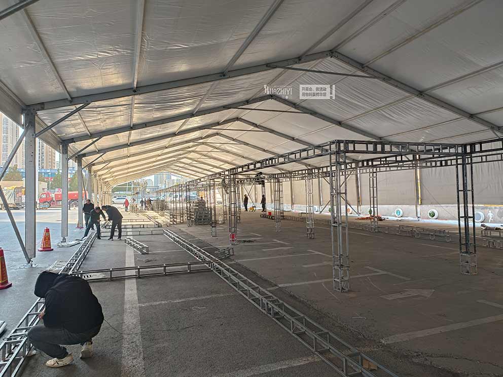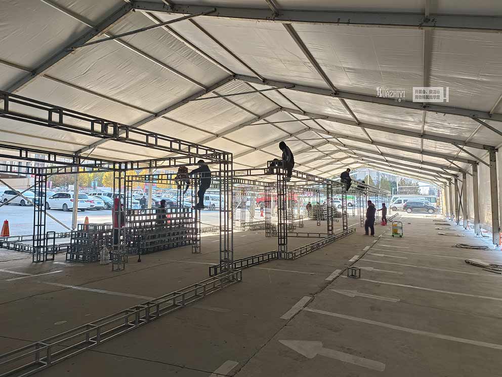 鄭州活動篷房出租篷內(nèi)還可以搭建桁架展位。鄭州華熠公司正在一處活動場地上搭建篷房,現(xiàn)在的篷房外部框架已經(jīng)落成,工人們正在搭建桁架展位,桁架展位可以進(jìn)一步將篷房內(nèi)的空間進(jìn)行劃分,使得空間多動能性增加不少。