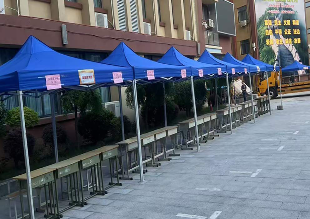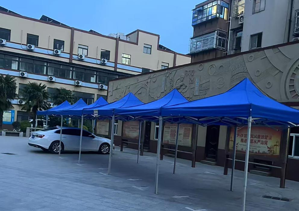 鄭州科技工業(yè)學(xué)校的校園里,幾頂藍(lán)色折疊帳篷在陽光下泛著沉穩(wěn)的光澤。這是鄭州篷房出租公司為校園活動(dòng)布下的臨時(shí)空間,靛藍(lán)色的篷布與周圍的綠樹、紅磚教學(xué)樓形成鮮明對比,卻又以恰到好處的尺度融入校園環(huán)境,為師生們提供著一片可遮陽避雨的實(shí)用角落。