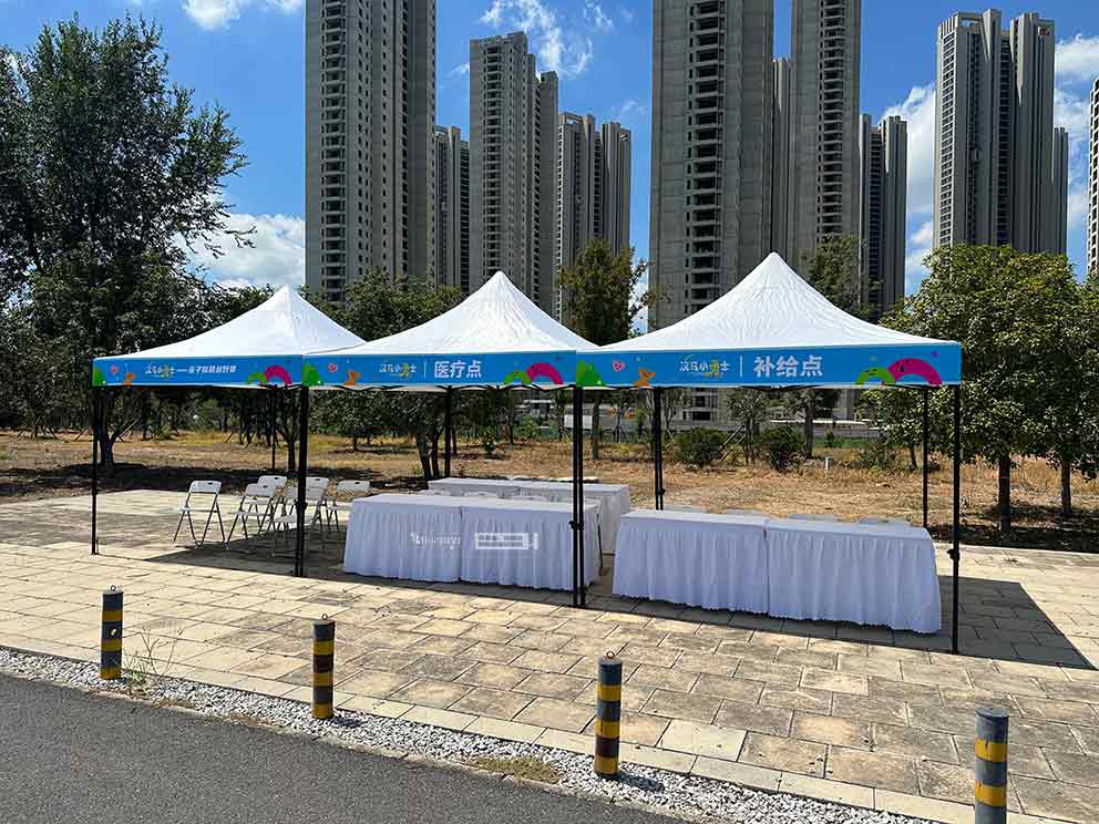 每頂帳篷間距 15 米,既避免功能重疊,又能形成 “按需覆蓋” 的服務(wù)網(wǎng)絡(luò),白色的篷身在綠色賽場(chǎng)中格外醒目,家長(zhǎng)和孩子遠(yuǎn)遠(yuǎn)就能識(shí)別方向。沒有圍布的設(shè)計(jì)讓帳篷內(nèi)外視線通透,工作人員能隨時(shí)觀察賽場(chǎng)動(dòng)態(tài),親子家庭也能輕松找到所需服務(wù)點(diǎn)。